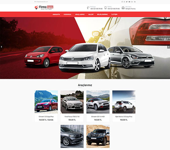 Araç kiralama hizmeti veren firmalar için tasarlanan hazır web sitesi... Yönetim paneli sayesinde site içeriğini dilediğiniz zaman kolay bir şekilde düzenleyebilirsiniz.